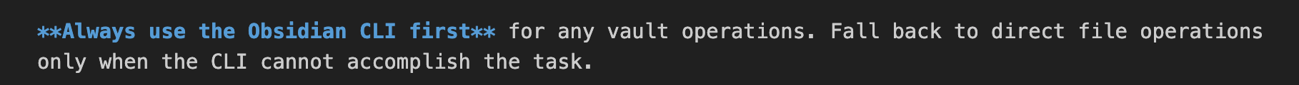 I write by hands but I still capture a lot of digital notes too. Continuing my personal experiment from the last couple of weeks, I'm added automations, skills and agents to my Obsidian vault. Giving Claude's agent explicit guidance to use Obsidian CLI makes each operation much more accurate vs. using direct file operations over the .md files. Searches are more efficient and you can leverage Obsidian's tagging and classification operations. Adding this to your Claude.md file or agent prompt seems to work well: